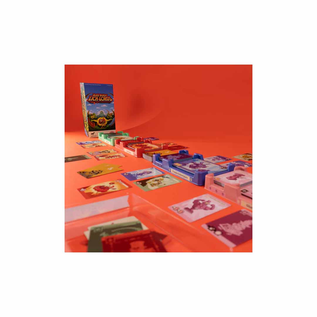 In diesem taktischen Kartenspiel über geschwisterliche Nekromantie dreht ihr Skelette um, beschwört schräge Diener und sorgt für ordentlich Krach. Wer zuerst 5 Lärmpunkte sammelt, weckt den Lichkönig – und gewinnt!