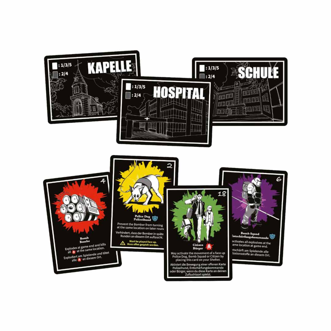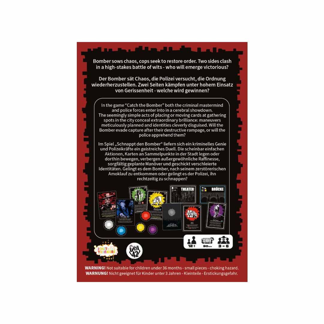 Im Spiel Schnappt den Bomber liefern sich das kriminelle Mastermind und die Polizei ein intellektuelles Kräftemessen. Die scheinbar einfachen Handlungen, Karten an Sammelpunkten in der Stadt zu platzieren oder zu bewegen, wollen von verschleierten Identitäten sorgfältig geplant und Manöver mit außerordentlicher Brillanz durchgeführt werden. Wird der Bomber nach seinem zerstörerischen Amoklauf der Gefangennahme entgehen oder wird die Polizei ihn fassen?
