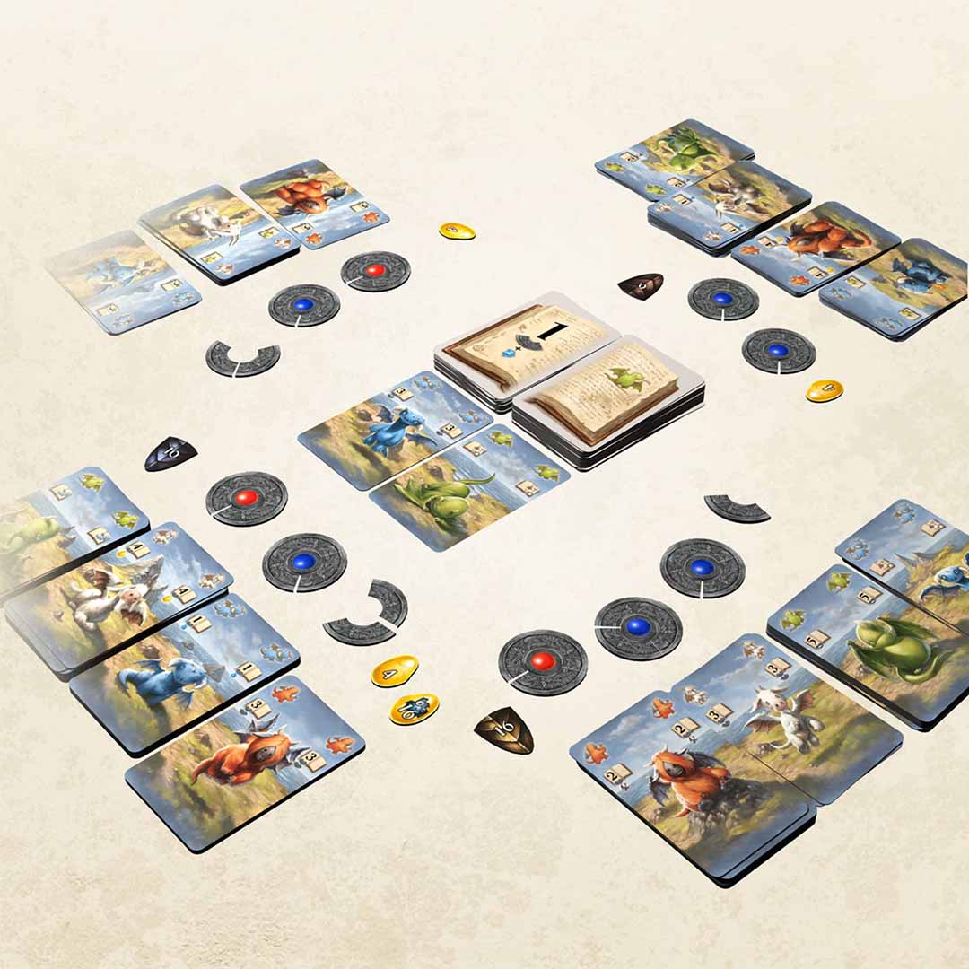 Als Zauberer sammeln 2-4 Spielerinnen und Spieler ab 8 Jahren Drachenkarten in einer Farbe. Dafür erhalten sie Teile eines Amuletts. Die Rückseiten der Kartenstapel geben vor, wie viele Drachen und welche Farbe sie vor sich auslegen dürfen. Möglichst viele Drachen von einer Sorte und viele auf einmal auslegen? Oder viele Amulette vollenden und wertvolle Perlen erhalten? Die richtige Taktik ist hier gefragt! Sobald eine bestimmte Amulette vollständig sind, endet das Kartenspiel.