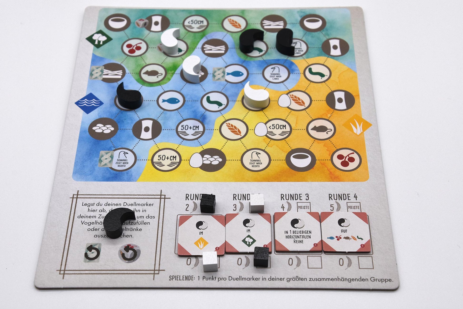 Im Duellmodus kommt ein weiteres Tableau ins Spiel. Immer wenn ihr eine Vogelkarte spielt, legt ihr einen Duellmarker auf ein Feld, das der Landschaft und einer bestimmten Eigenschaft des gespielten Vogels entspricht. Manche dieser Felder geben euch einen sofortigen Bonus. Bei Spielende bekommt ihr zusätzlich Punkte für euer größtes zusammenhängendes Gebiet.