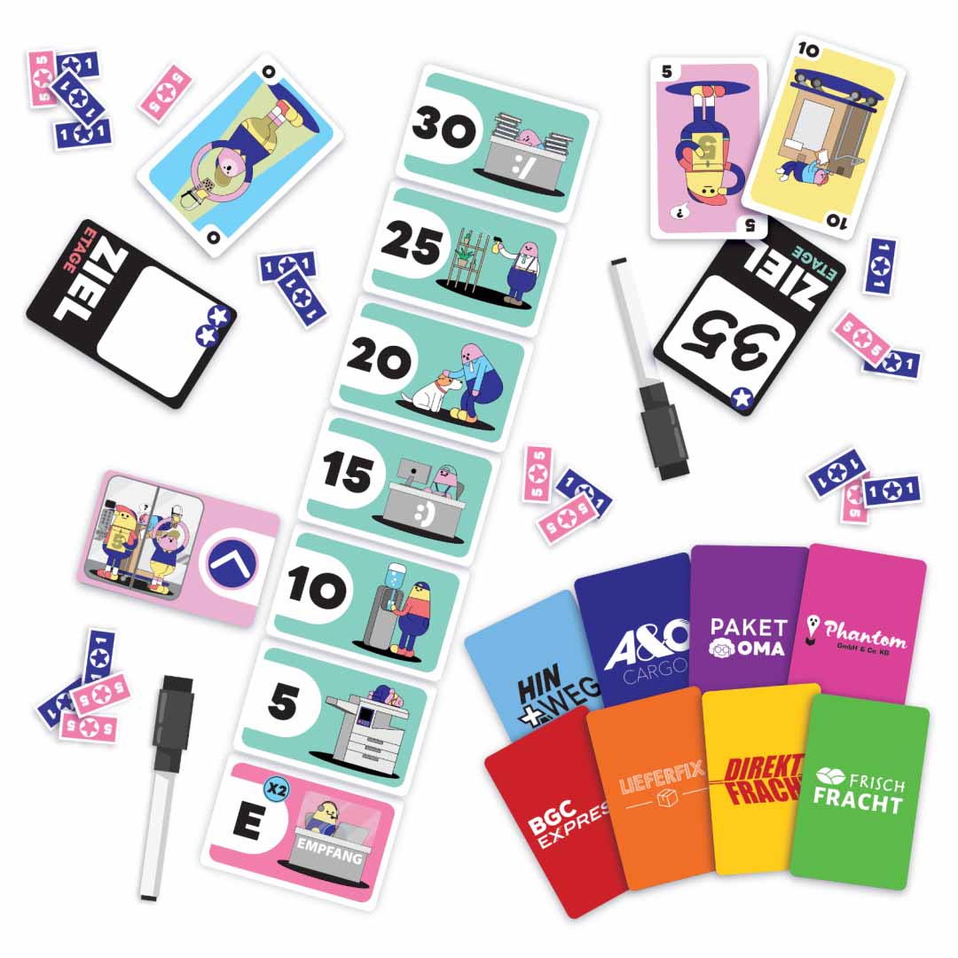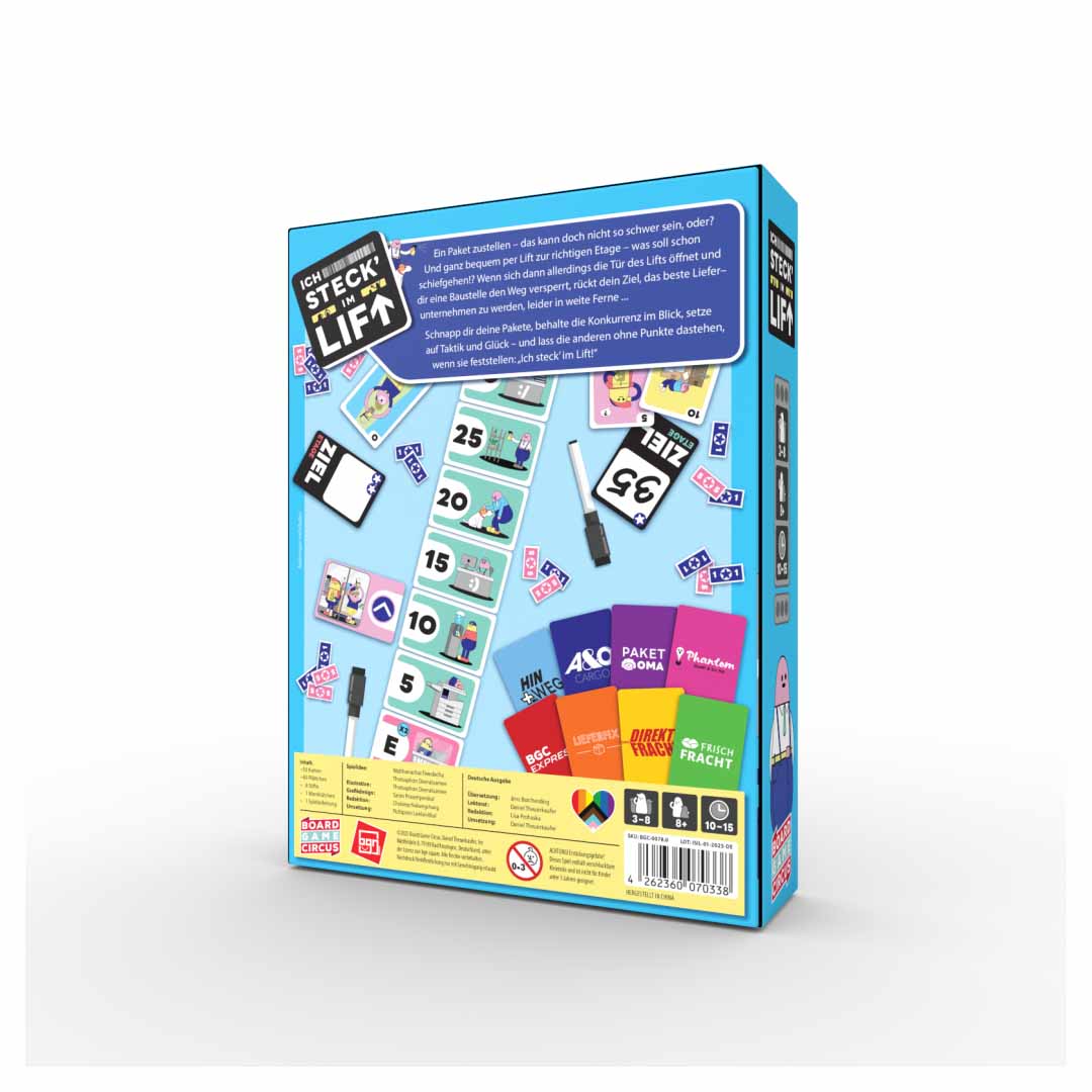 Ich steck‘ im Lift ist unser neues spaßiges Kartenspiel. Die Aufgabe ist eigentlich ganz einfach: Ein Paket auf der richtigen Etagen abliefern. Allerdings kommt dir deine Konkurrenz immer in die Quere und dann ist auch immer irgendeine Etage aufgrund einer Baustelle gesperrt.