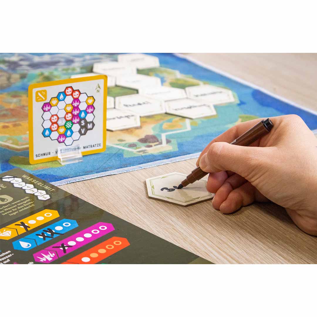 In dem assoziativen Wortspiel Landmarks begeben sich die Spielenden gemeinsam als Expeditionsteam auf die gefährliche Suche nach Juwelen.