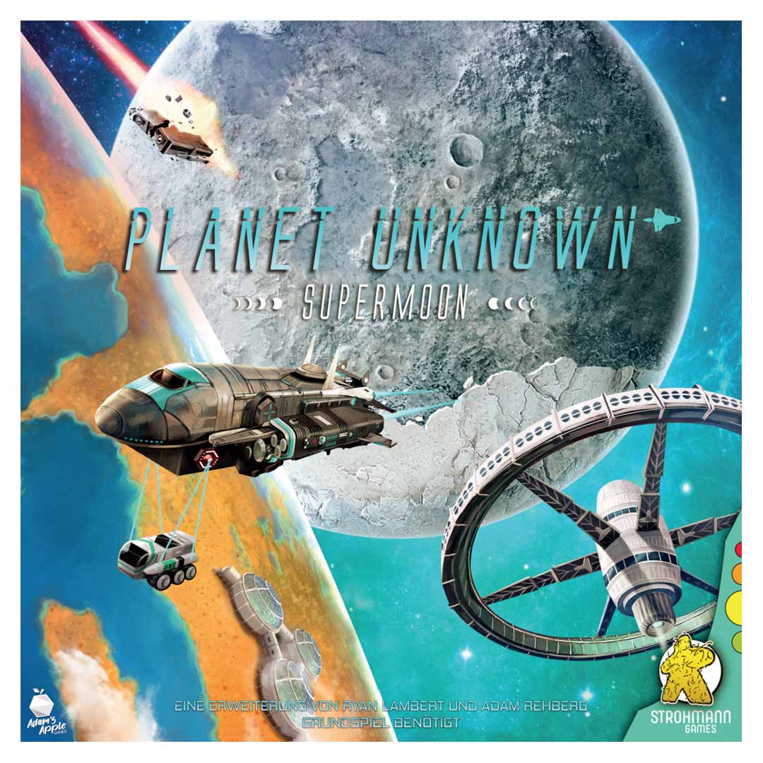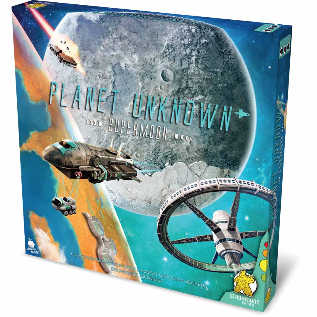 Supermoon ist die erste Erweiterung zu Planet Unknown. Ihr könnt die neuen Module (Supermond, Rettungsplättchen, Bonusplättchen) beliebig kombinieren und zu eurem Grundspiel hinzufügen, sowohl im Mehrspielerspiel als auch im Solomodus. Der neue Spezialkonzern und Spezialplanet bieten besonders viel Abwechslung und neue Heraus-forderungen.