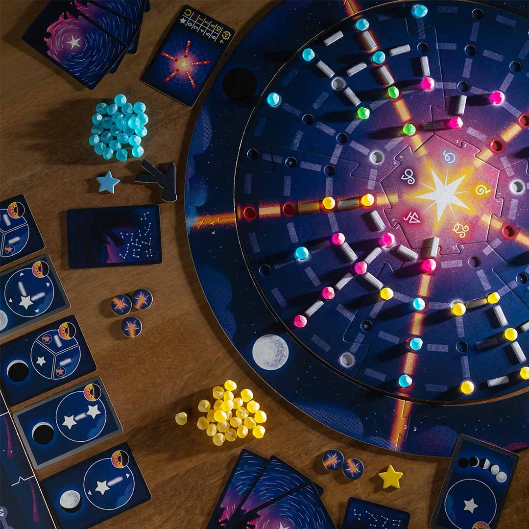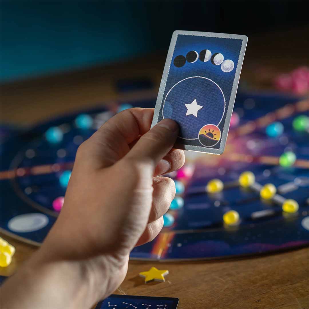 Alles dreht sich um Polaris, den Nordstern. Ein kompetitives Sternenlegespiel das durch sich verändernde Mondphasen immer spannend bleibt.