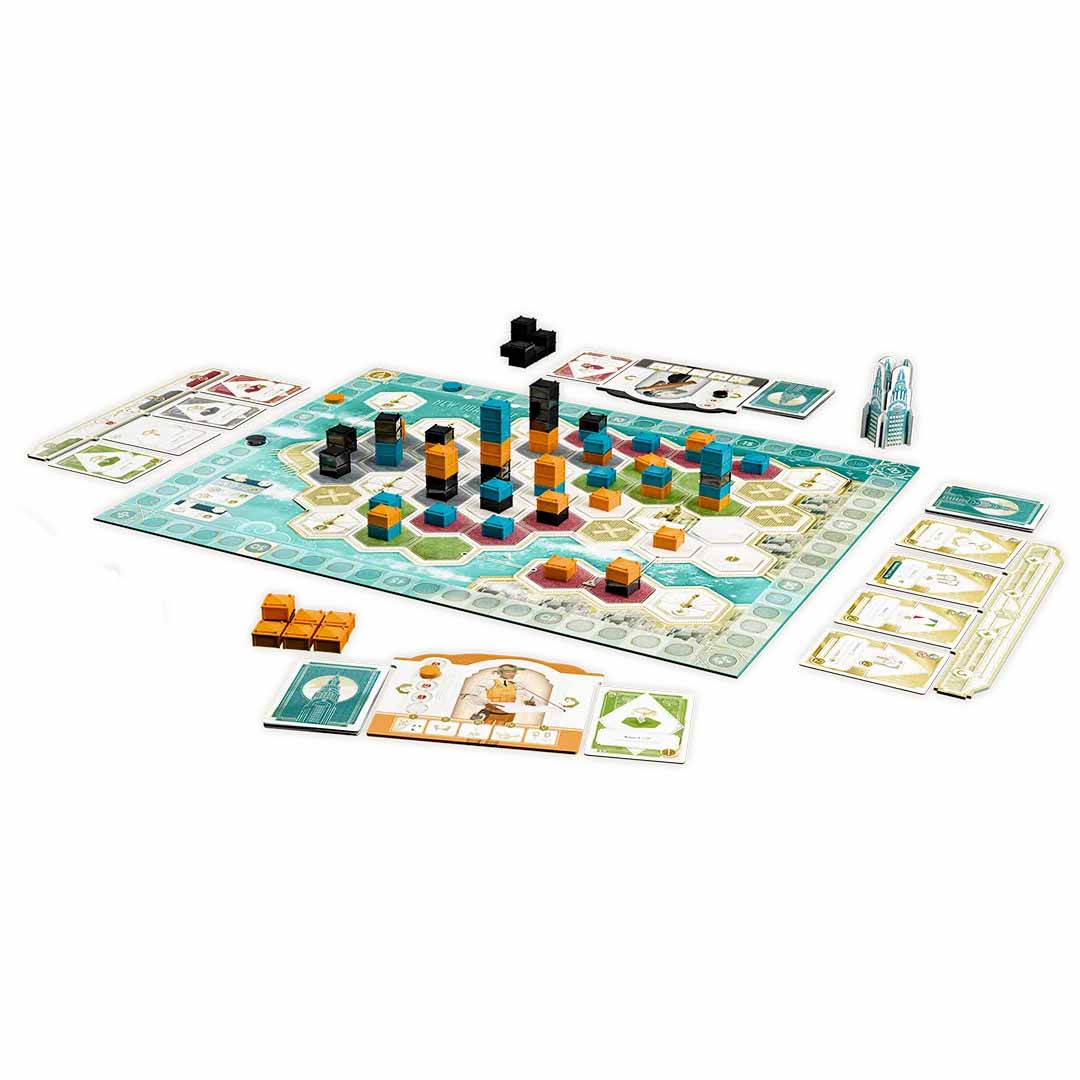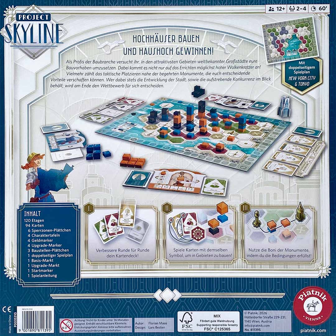 Eine beeindruckende Skyline kennzeichnet die beiden Städte, deren Immobilienmarkt seit jeher heiß umkämpft ist. Immer höher nach oben wachsen die Gebäude, deren Wert oft von ihrer Lage zu den zentralen Wahrzeichen bestimmt wird. So auch im innovativen Deck-Building-Spiel Project Skyline, das einen strategischen Wettstreit rund ums Bauen von Hochhäusern und die Entwicklung attraktiver Stadtviertel auf einem großen Spielplan umsetzt. Wer bei Project Skyline clever baut, ist der Konkurrenz immer eine Nasenlänge und häufig sogar ein Stockwerk voraus. Etage für Etage gestalten die Spielenden die Stadt und dürfen dabei auch bereits bestehende Gebäude für sich nutzen. Aber echte Profis wissen: Entscheidend ist nicht nur die Höhe der Immobilien, sondern auch die Lage.