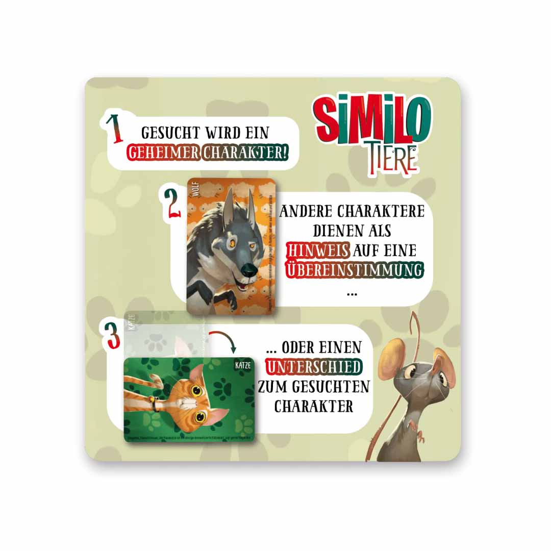 Bei Similo: Tiere geht es darum, als Team ein ganz bestimmtes Tier zu finden. Nur ein Spieler weiß, welches der ausliegenden Tiere das gesuchte ist. Er legt immer eine Karte als Hinweis auf Gemeinsamkeiten oder Unterschiede. Die Ratenden schließen nach und nach eines der Tiere aus, bis am Ende – hoffentlich – nur noch der geheime Charakter übrig ist.