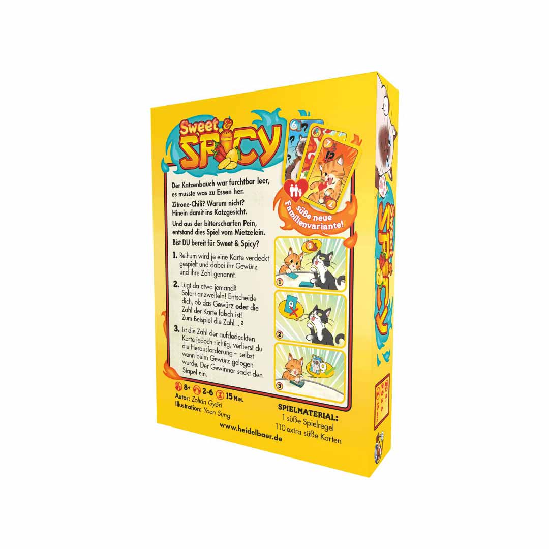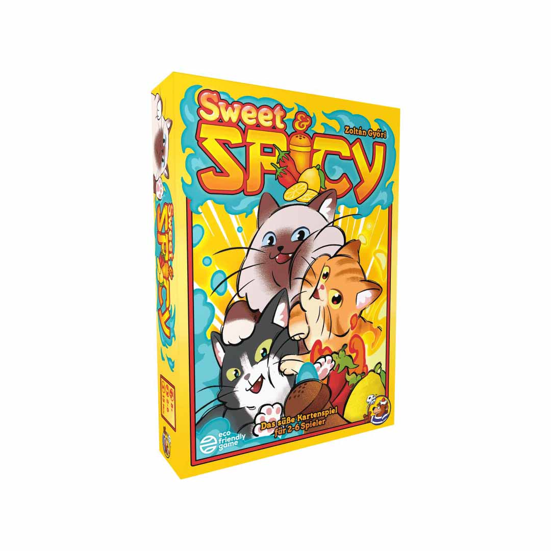 Sweet & Spicy ist ein Bluff-Kartenspiel für 2–6 Spieler und die kinderfreundliche Variante von Spicy. Anstatt von Wasabi kann man nun die Zitrone spielen und es gibt eine neue Karte im Spiel: den Super-Joker. Das Spielprinzip bleibt aber gleich.