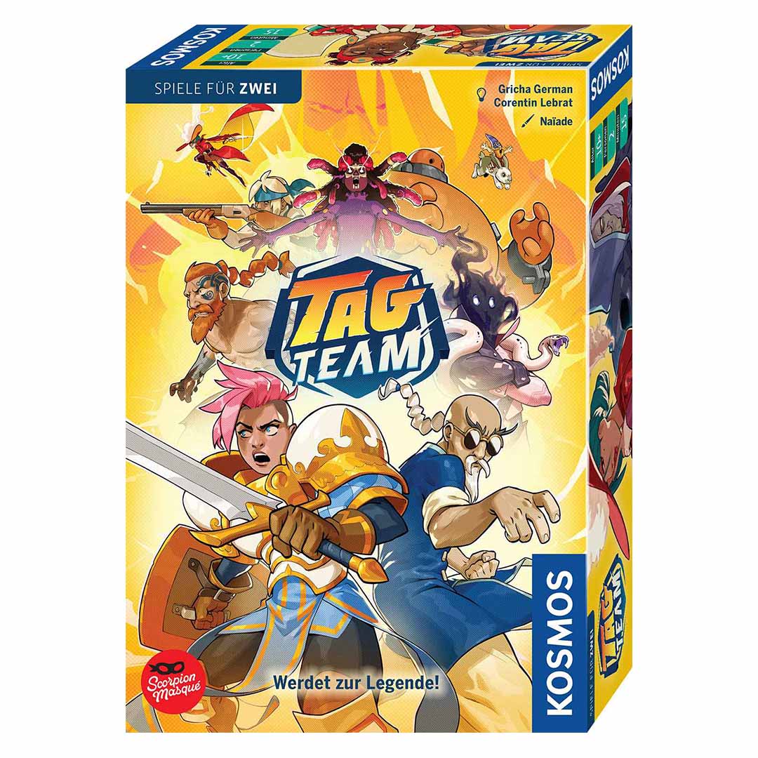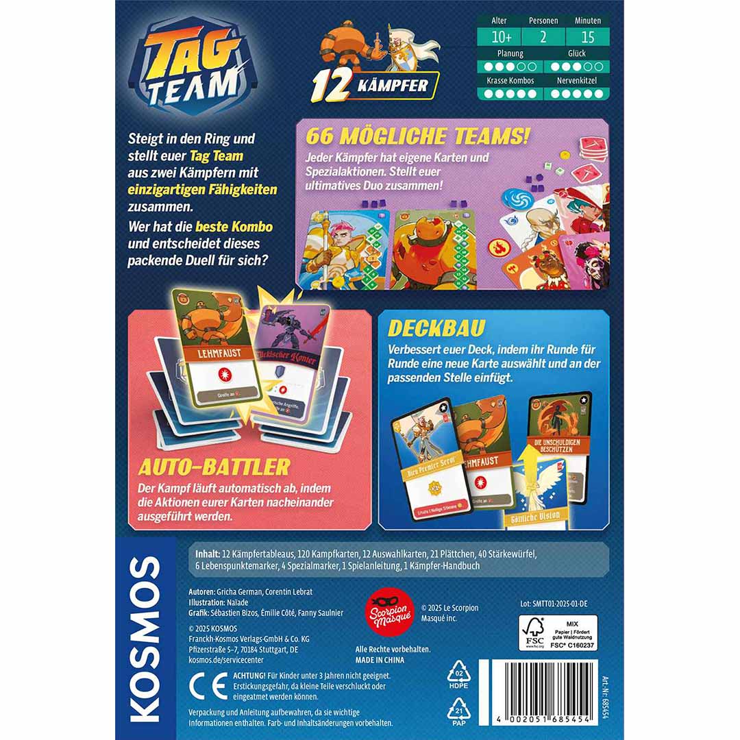 Auf in den Ring: Welches Tag Team gewinnt das Duell? Im spannenden 2er-Spiel stellen sich die beiden Spielerinnen und Spieler je ein Tag Team aus zwei Kämpferinnen und Känpfern zusammen. Mit deren kombinierten Kartendecks treten sie Runde für Runde gegeneinander an, indem immer die oberste Karte aufgedeckt und die Effekte ausgelöst werden.