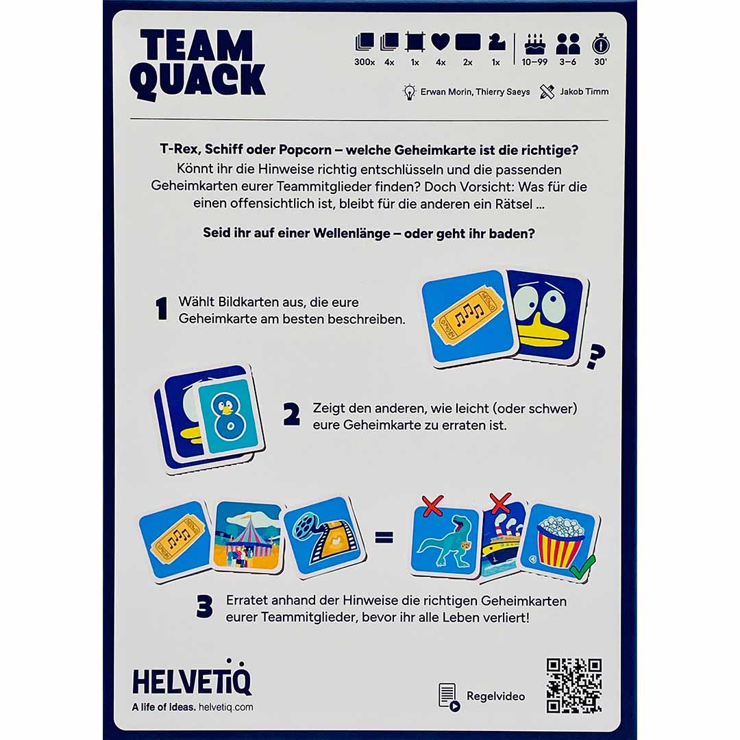 Team Quack ist ein kooperatives Spiel, bei dem scharfe Beobachtung und clevere Hinweise euch zum Erfolg führen! Arbeitet zusammen, entschlüsselt die Geheimkarten und gebt einander die richtigen Hinweise – ohne zu viel zu verraten.